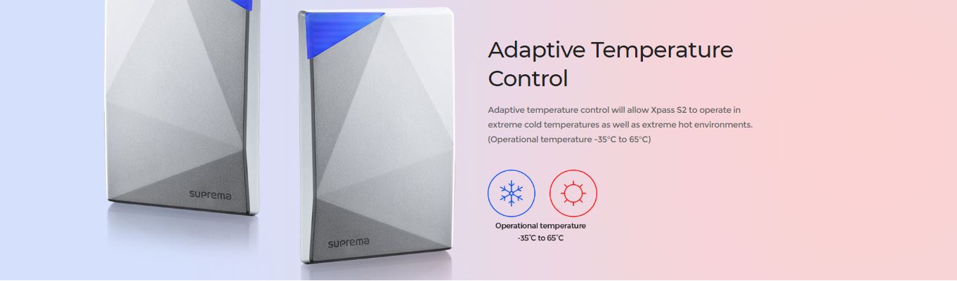 Kiểm soát nhiệt độ thích ứng sẽ cho phép Xpass S2 XPS2M hoạt động ở nhiệt độ cực lạnh cũng như môi trường cực nóng. (Nhiệt độ hoạt động từ -35 ° C đến 65 ° C)