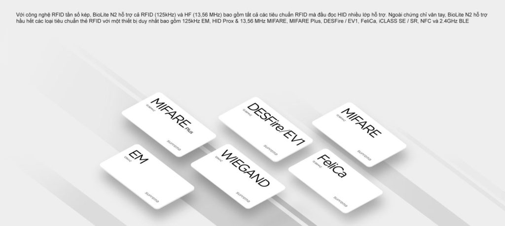 Ngoài vân tay, BioLite N2 hỗ trợ công nghệ RFID đa lớp, cho phép đọc nhiều loại thẻ khác nhau, giúp hệ thống linh hoạt trong: