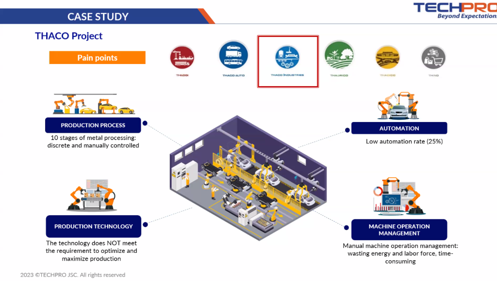 Đặc biệt, diễn giả cũng chia sẻ thành công trong dự án chuyển đổi số cho nhà máy THACO, bài toán được bên phía THACO đặt ra trong bối cảnh tình trạng quản lý thủ công, tỷ lệ tự động hóa thấp, quản lý năng lượng chưa hiệu quả dùng nhu cầu cải tiến hiệu suất sản xuất.