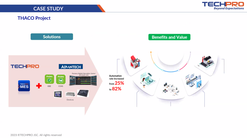 Với giải pháp TECHPRO – MES (Hệ thống điều hành sản xuất) giúp thực hiện các hoạt động trong quản lý sản xuất cùng với giải pháp OEE, FEMS, thiết bị của ADVANTECH. Dự án đã đem lại nhiều kết quả tích cực như: tăng tỷ lệ tự động hóa (từ 25-85%), năng suất tăng 6.000 tấn (2018) lên 12.000 tấn (2022).